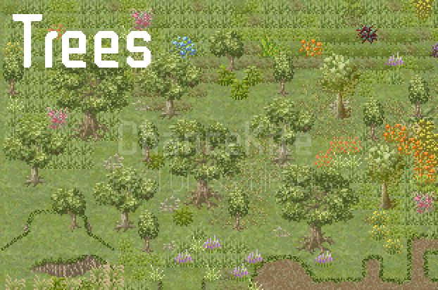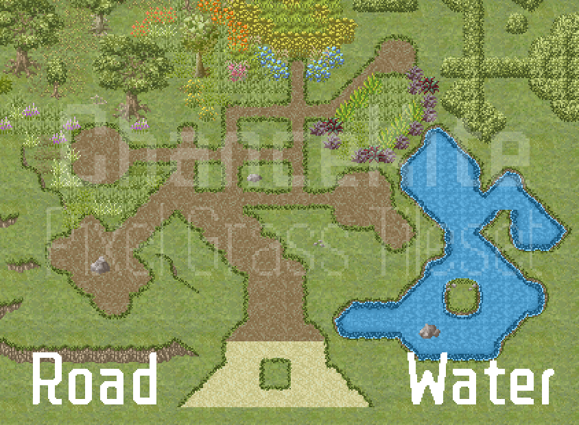 Landscape Tileset: 5 Trees, 6 Rocks, Dirt/Sand road, Water/Cliff design, Bush path, leaf litter texture, and grassland texture.